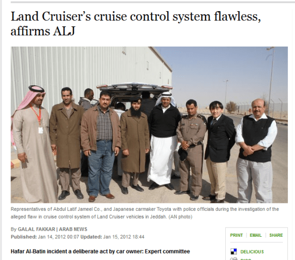 After a series of tests on the car and what was Abdul Latif Jameel’s explanation? Hafar Al-Batin incident a deliberate act by car owner: Expert committee (byline from the follow day’s Arab News which can be read here).