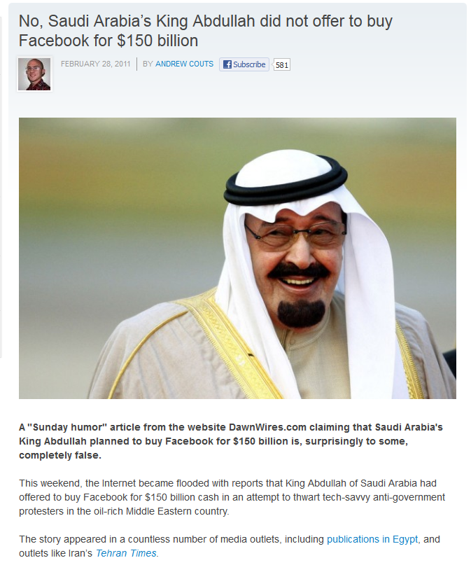 No, Saudi Arabia’s King Abdullah did not offer to buy Facebook for $150 billion.