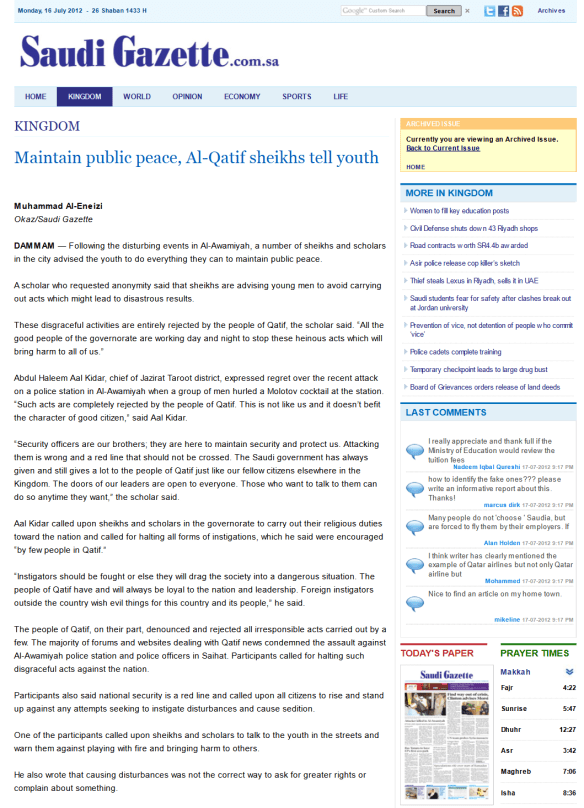Maintain public peace, Al-Qatif sheikhs tell youth was the standard line in many Saudi media publications.