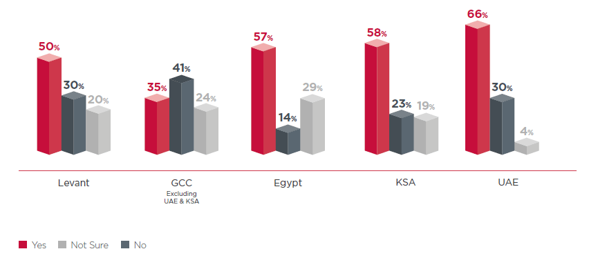 Executives were also asked if CSR has become important (no surprises here, it has), as well as if they intend to keep up their CSR activities in 2022 – Egyptian, Saudi and the UAE executives said they would do more, while Levant and GCC executives said they’d do the same.