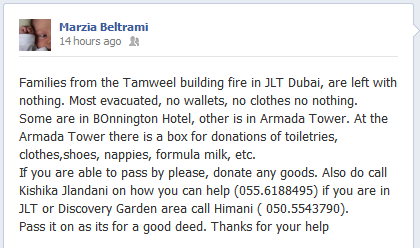 It’s no exaggeration to say that many families lost everything in the fire. Radio interviews with Tamweel Tower residents spoke of people running out wearing only their underwear and having to borrow clothing from others after they’d assembled at the emergency evacuation points outside the building. A wonderful piece was written in the Khaleej Times, a piece that conveyed the feeling of loss and confusion. If you’re hoping to gain a sense of how much some people were going through on the morning of the fire then do click through and read.