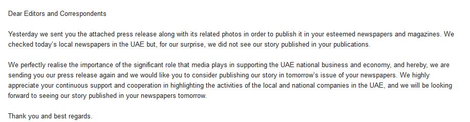 The first is from a local company in the UAE. Written by a former editor (who should know better), the message ticks off the media for not running the release the day before. Is this really going to get your news published? The short answer is most likely not.