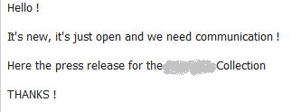 The second pitch is more brief, but just as useless, in that it doesn’t tell the journalist anything. Instead, it almost shouts we’re here so publish something. For a pitch about a fashion collection, so much more could have been done particularly around visuals, to get the news published.