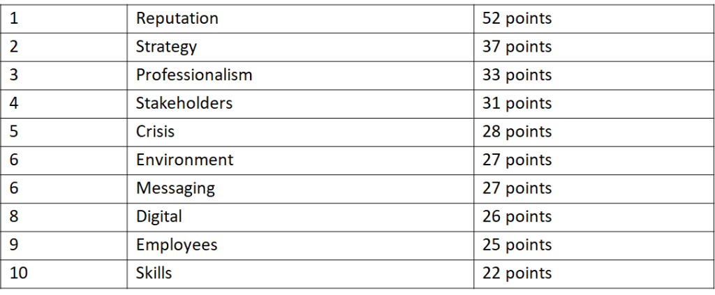 Out of the top ten, what I also found interesting was the focus on crisis communications (is this driven by social media, I wonder), as well as environment (this means a contextual understand of all the factors we’re dealing with regarding our functions and organizations), and digital (I’d assume this reflects how quickly we’ve become a connected society).