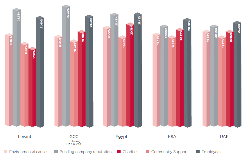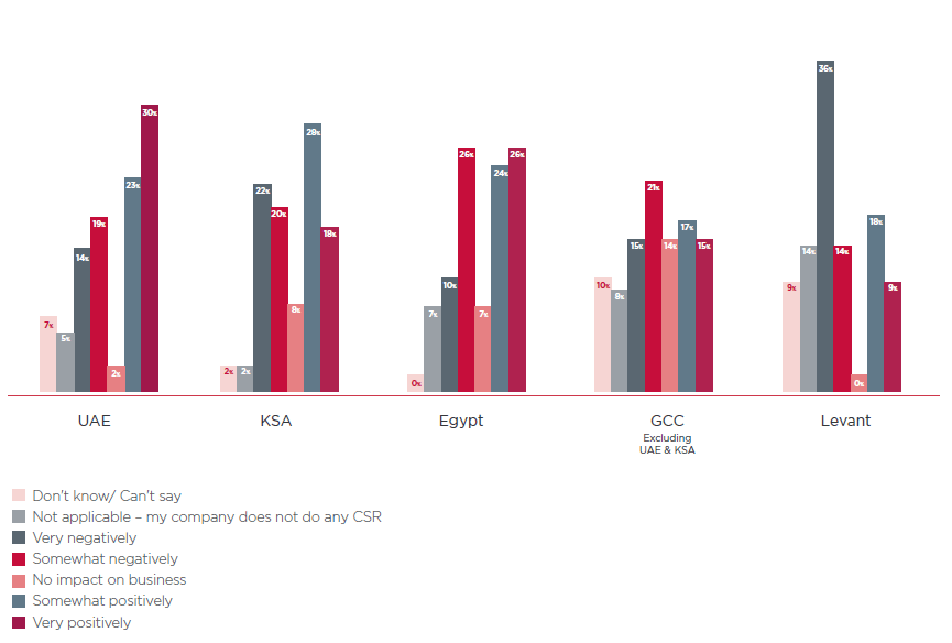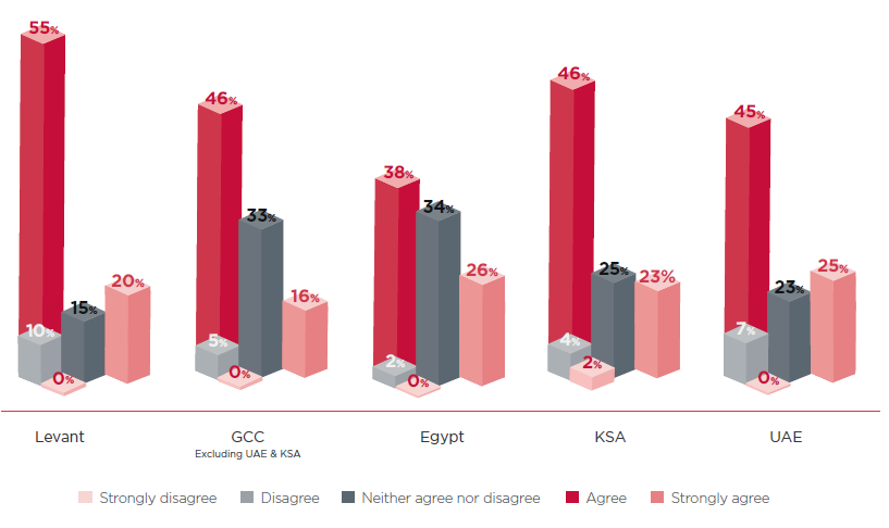 There were two statements on how CSR relates to business. The first was, “How do you think adopting CSR affects a company’s business overall?” The overall sentiment was agree/strongly agree, with the lowest score being 80% in the Levant (Jordan and Lebanon). The highest scores were in Saudi (92% agreed or strongly agreed) and the UAE (95% agreed or strongly agreed). The second statement put to those surveyed was, “How important is it for a company to adopt CSR into its business practices?” The response was again overwhelmingly positive, with 92% agreeing or strongly agreeing that adopting CSR positively impacts a company’s business.