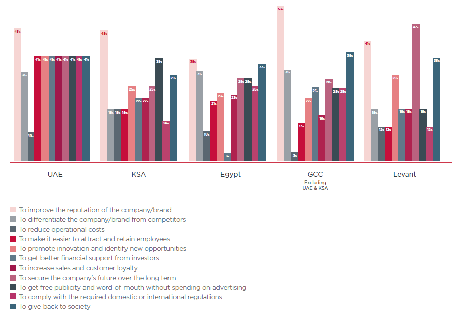 We now get to the why and how. Those surveyed were asked, “Why do you think it’s important for a company to adopt CSR into its business practices?” The primary response, with the exception of the Levant, was to improve the reputation of a company/brand (the Levant response was to secure a company’s future over the long-term, which may be a nod towards Lebanon’s economic distress) . The second isn’t so clear-cut; in Egypt, the Levant and the GCC excluding KSA and the UAE the purpose is to give back to society. In Saudi it is to get free publicity via word-of-mouth advertising. And in the UAE there’s a host of reasons.